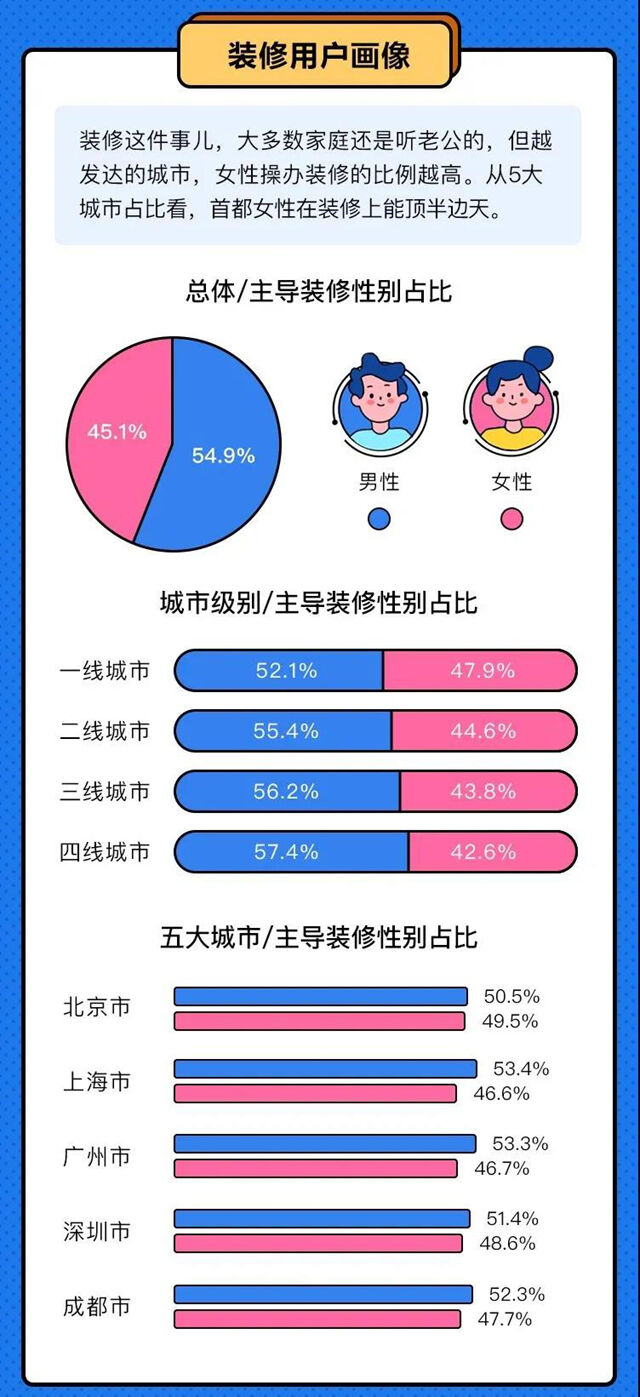 报告显示,北上广深等一线城市在基础装修上,业主的平均预算只有7.1万元,二线城市接近于7.9万元,三四线城市会更高,分别为8.5万元和9.3万元。
