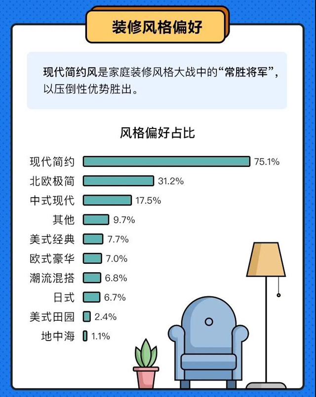 业内专家指出,有这么多业主选择简约风,跟整个行业的设计趋势有很大关系。近年来,家装设计师更倾向于做去风格化、去标签化的设计,希望回归体验空间和材料的本质,弃繁从简不容易过时。如果后期厌倦了简约的居住风格,业主还可以通过一些简单但精致的软装元素,比如:窗帘、壁纸、床、沙发等,局部改变空间风格,解决个性化需求,感受不一样的生活体验。这也反映了现代年轻人一种更洒脱的生活价值观。