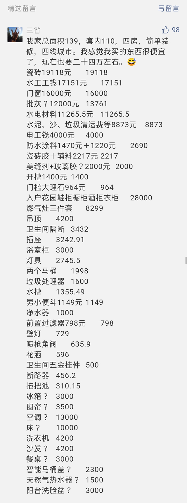 “我家总面积139,套内110,四房,简单装修,四线城市。我感觉我买的东西很便宜了,现在也要二十四万左右”。还列出了清单。